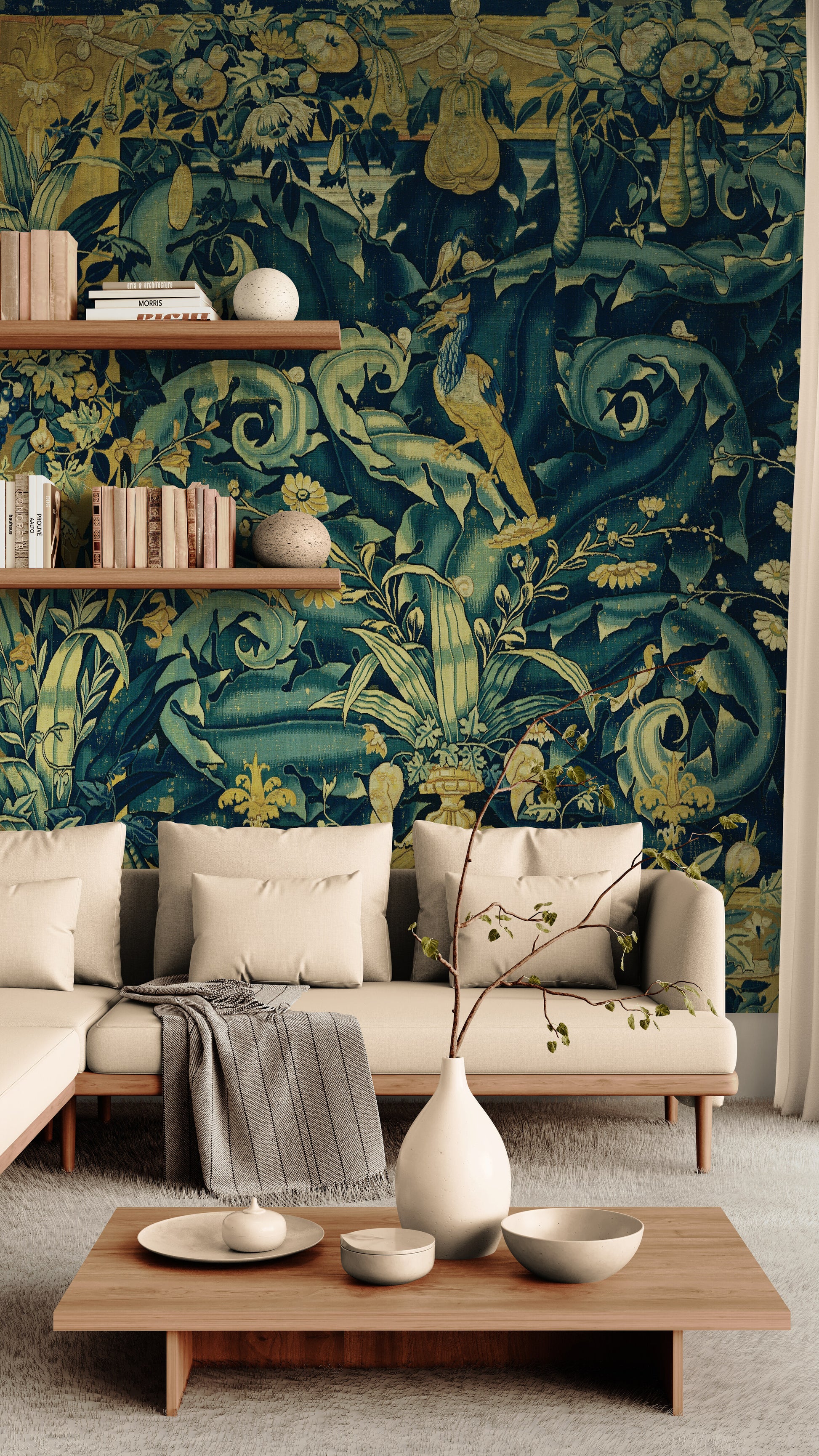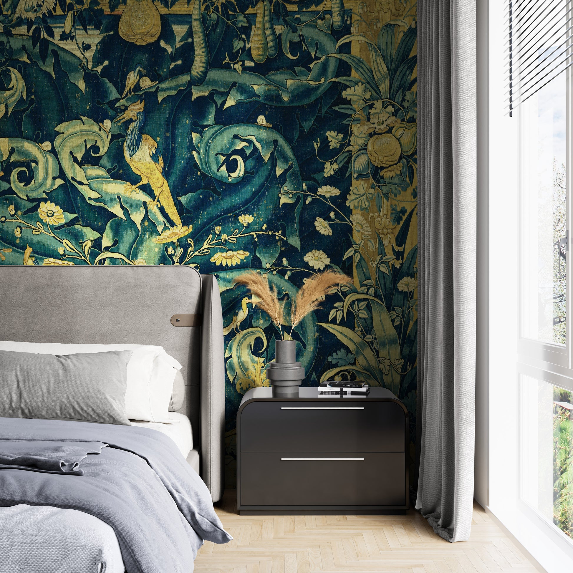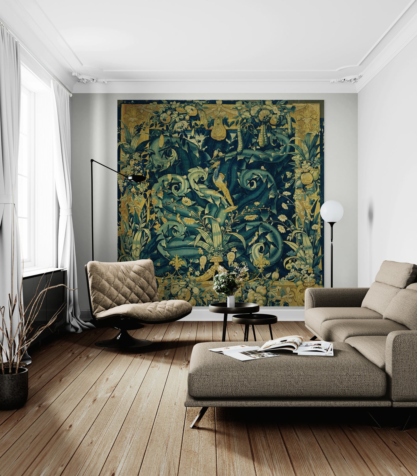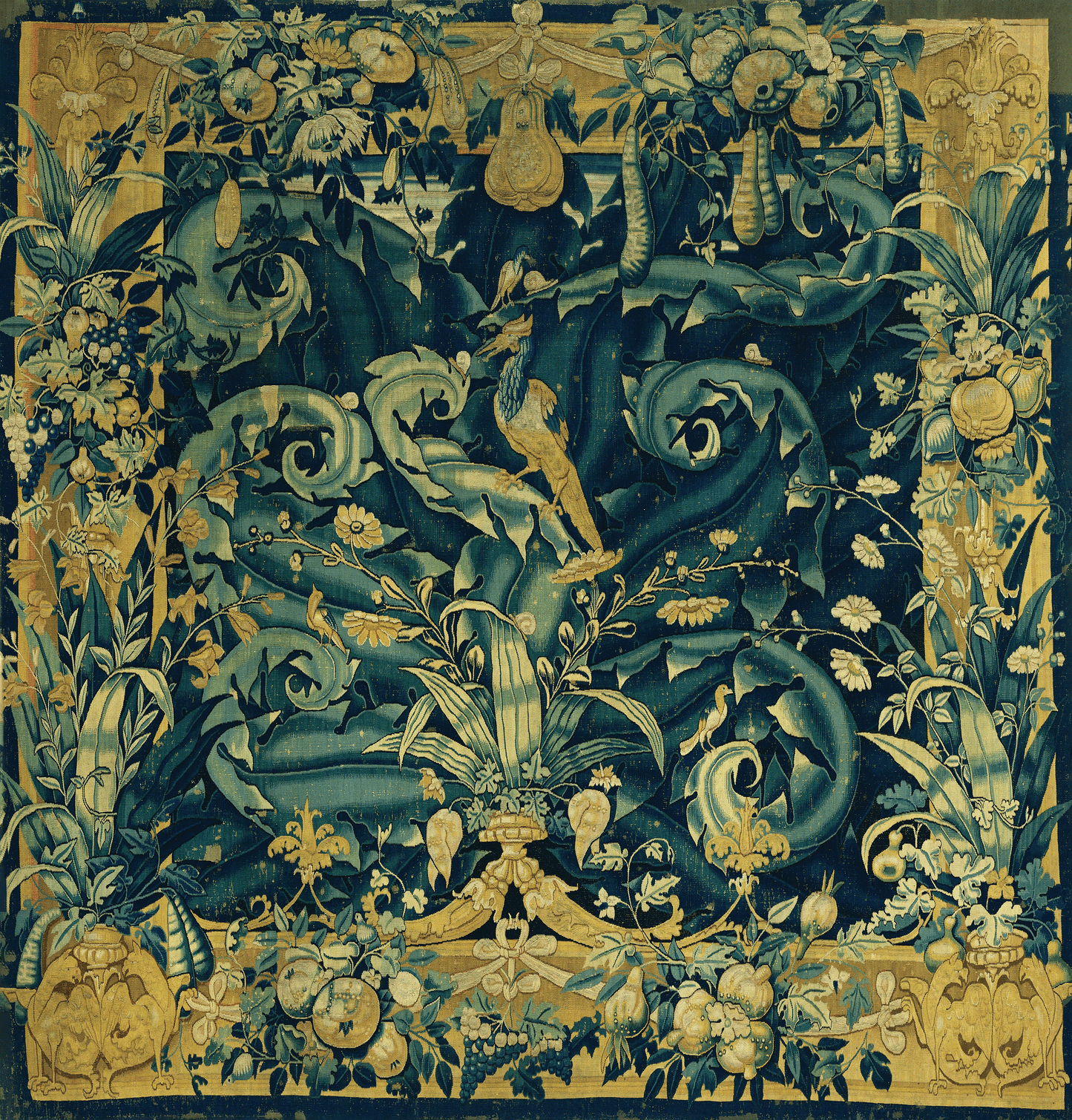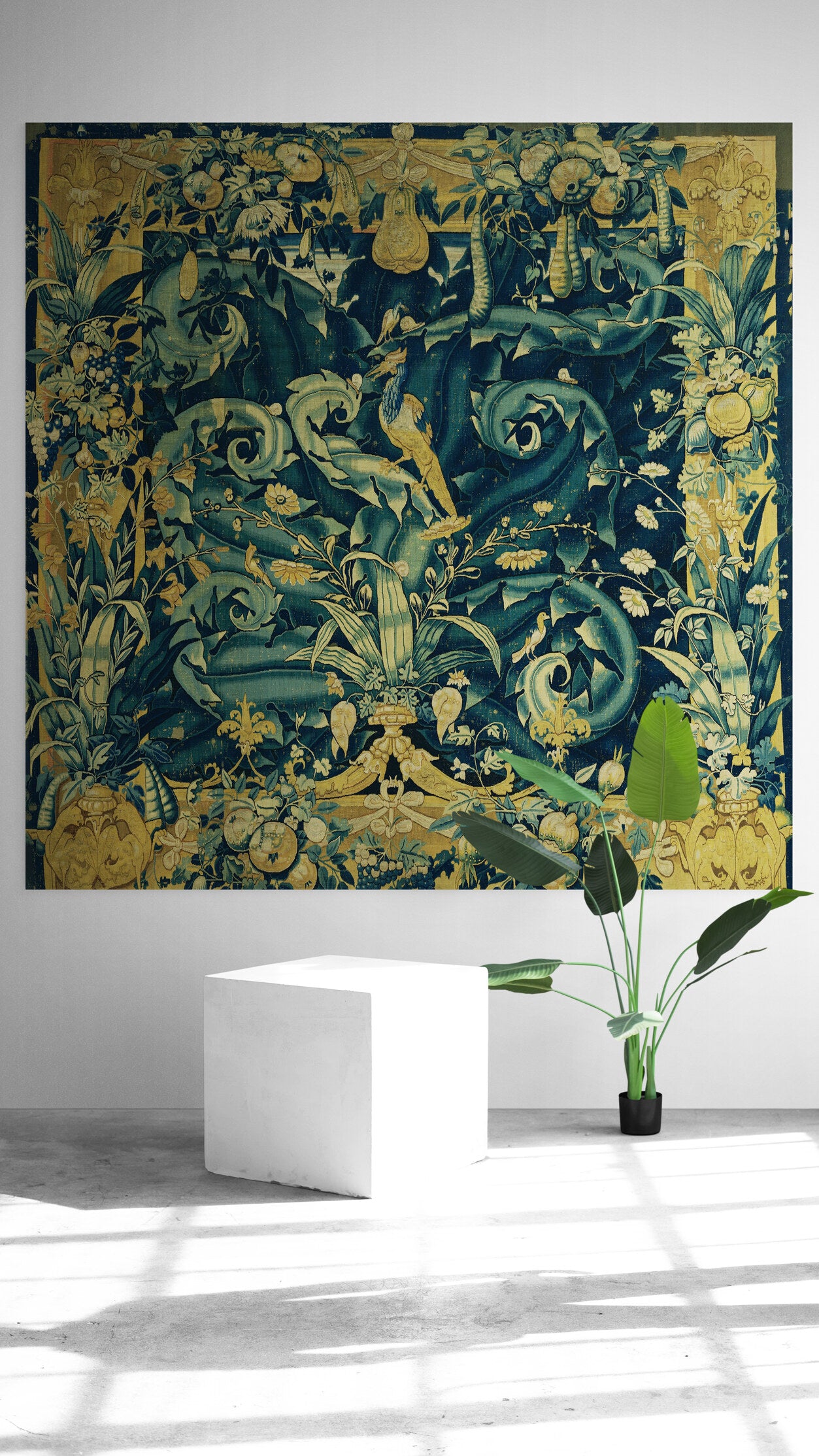This type of verdure tapestry, with its lush depiction of plant life, was all the rage in the 16th and 17th centuries, particularly in the esteemed weaving workshops of Brussels and Aubusson. These tapestries were highly sought after for their ability to bring the tranquility and beauty of the outdoors into the grand halls and chambers of Europe’s nobility. The large leaf design, often referred to as "feuilles de choux" (cabbage leaves) or "feuilles d'aristolochia," became a hallmark of this period, celebrated for its dramatic and luxuriant representation of nature.