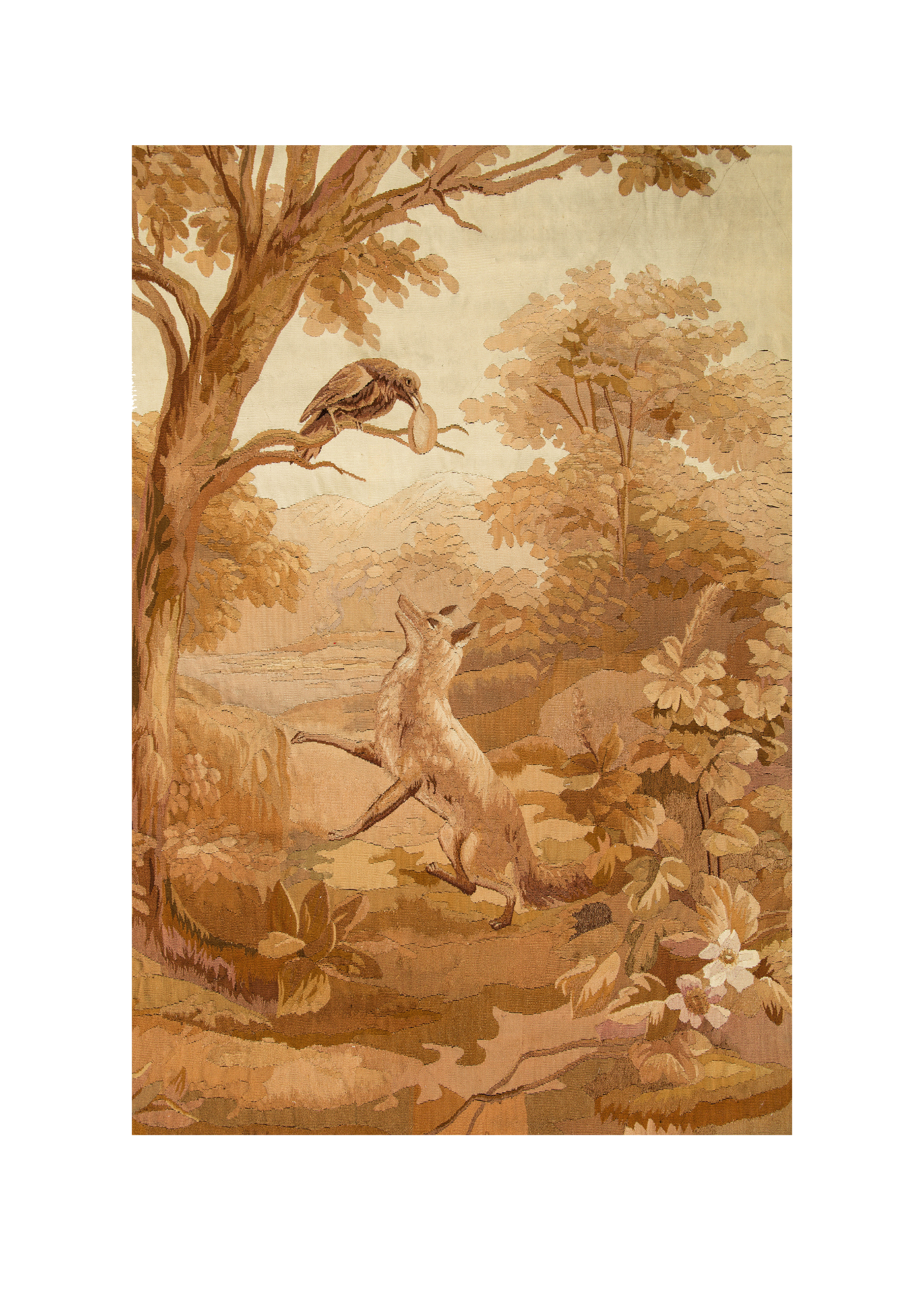 This tapestry likely draws from 18th-century French tapestry traditions, where scenes from fables and pastoral life were popular subjects. Workshops in Aubusson and Beauvais were particularly known for producing such pieces, with their artisans adept at capturing the fine details and subtle nuances that bring these stories to life.