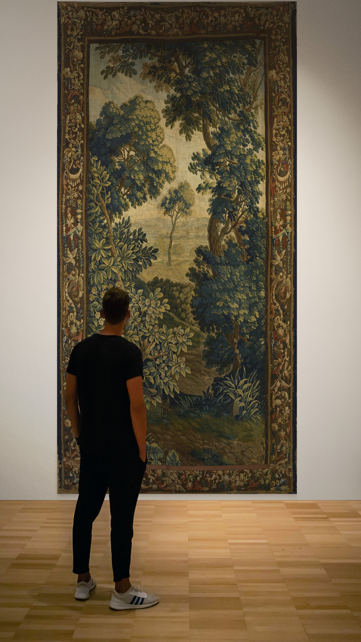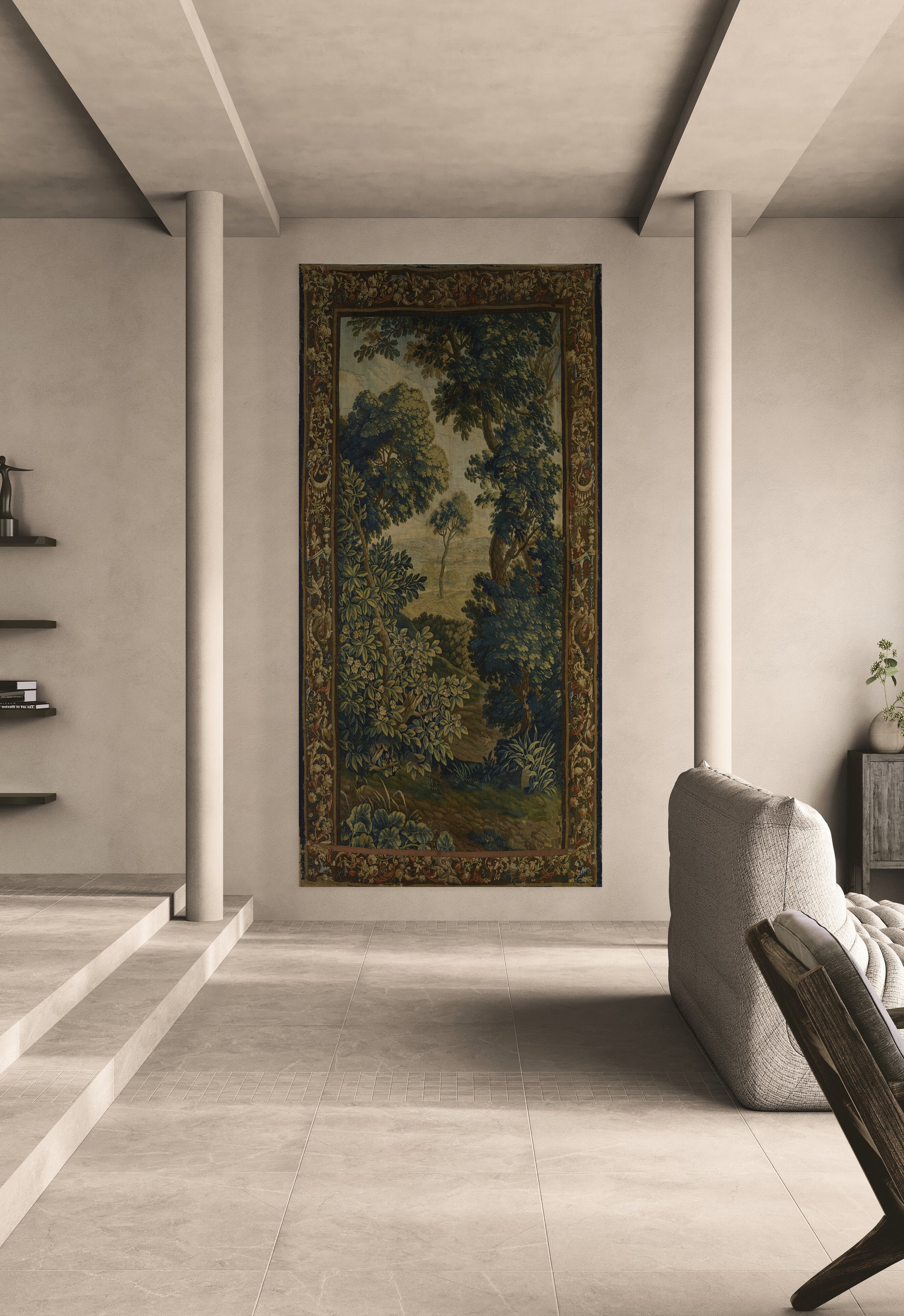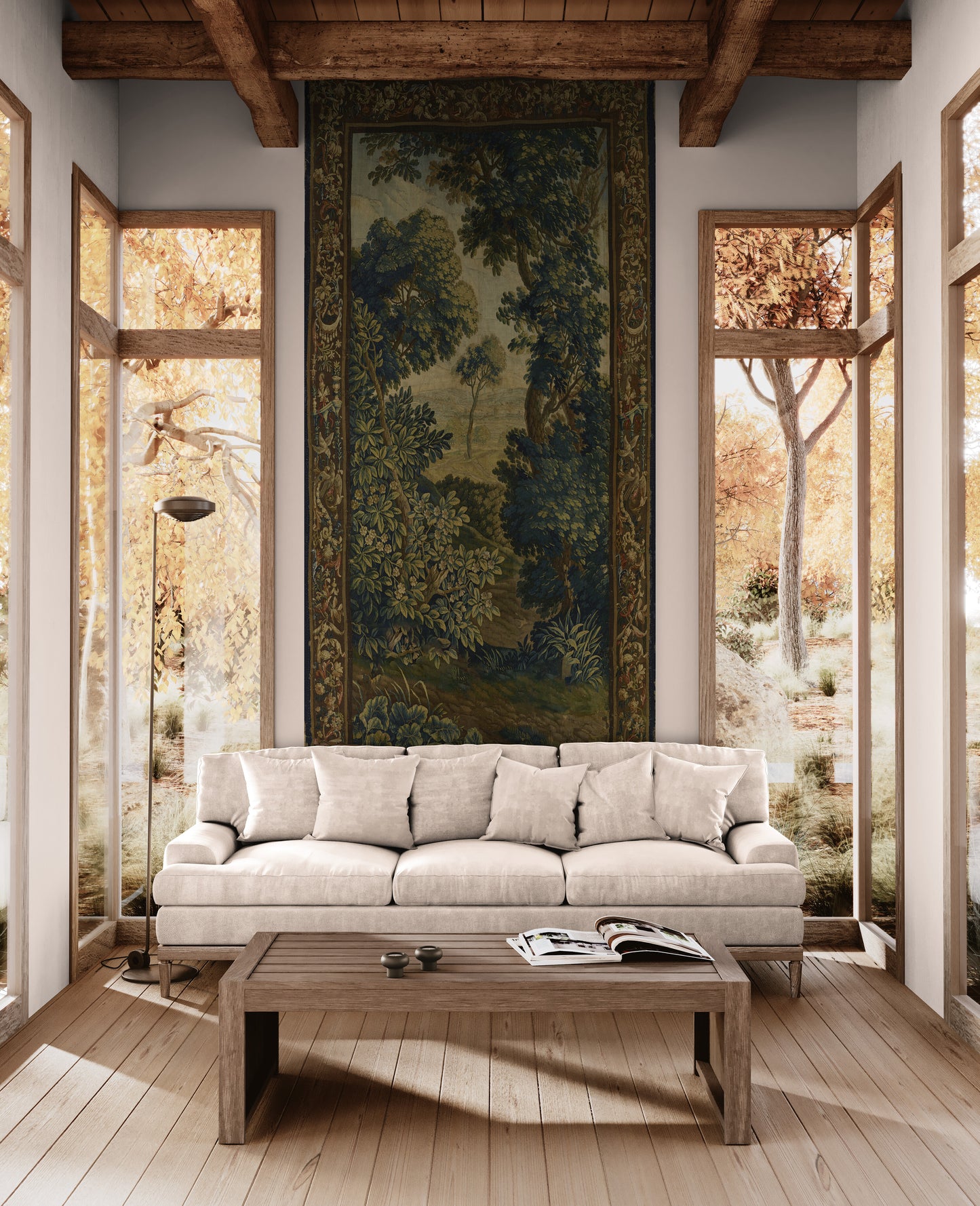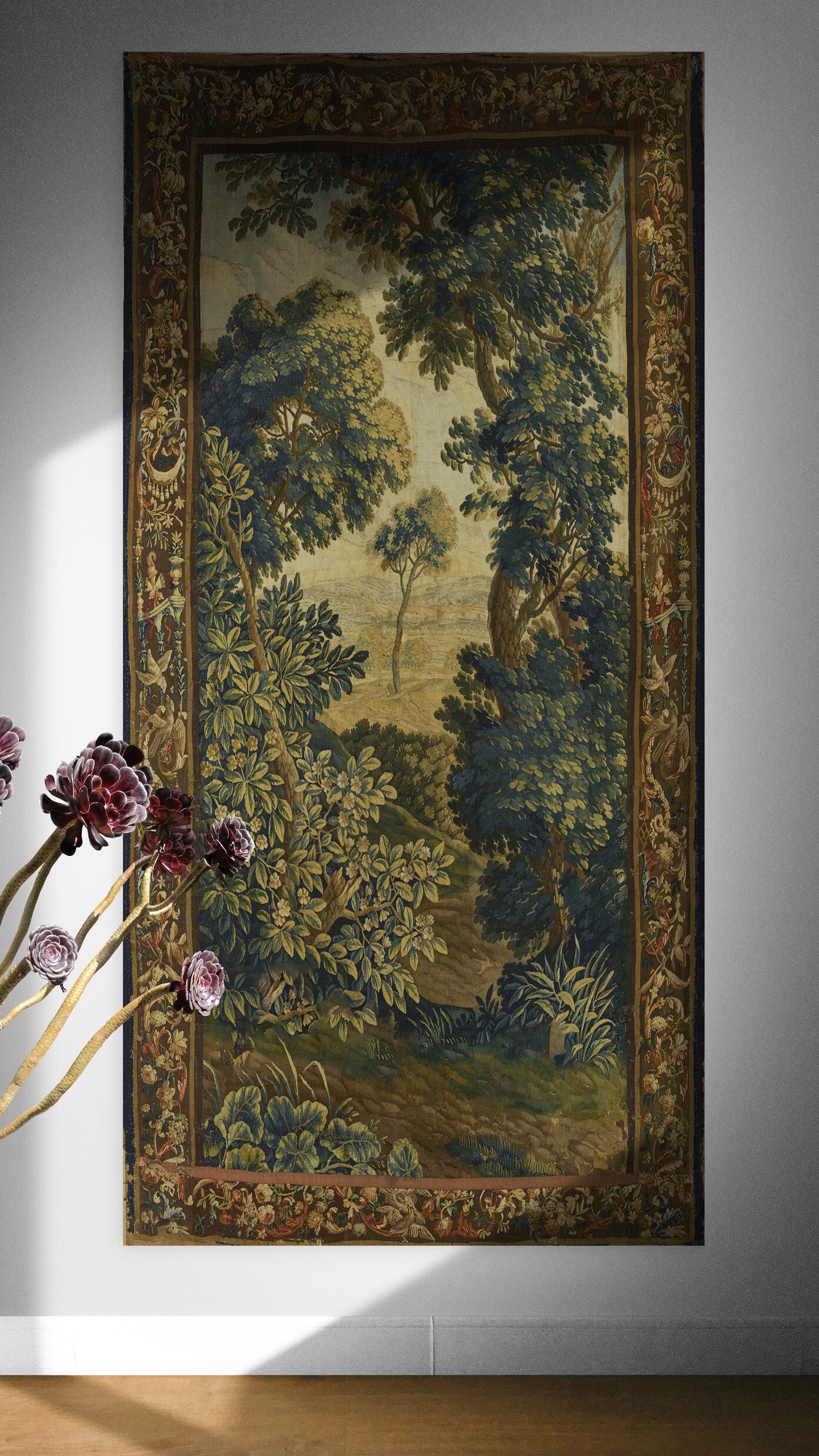 Allow me to present to you an extraordinary work of art—a Flemish tapestry that transports you to a serene and idyllic woodland, crafted with the meticulous precision and profound artistry that only the master weavers of the late 17th century could achieve. This magnificent piece is a quintessential example of the Verdure tapestry, a style that flourished during the Renaissance and Baroque periods, particularly in the famed weaving centers of Flanders.