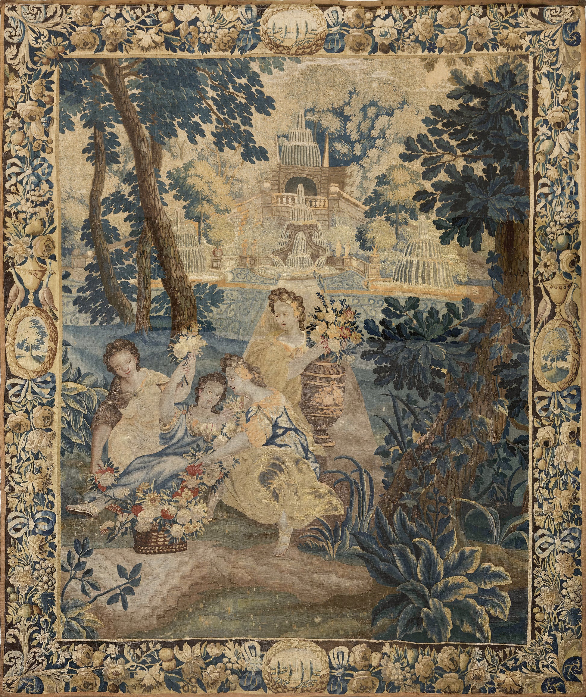 The border of the tapestry is as detailed as the central image, featuring a garland of flowers and urns that echo the opulence and sophistication of the garden. The border's design complements the main scene, drawing the eye inward while also providing a sense of unity and completeness to the overall composition.